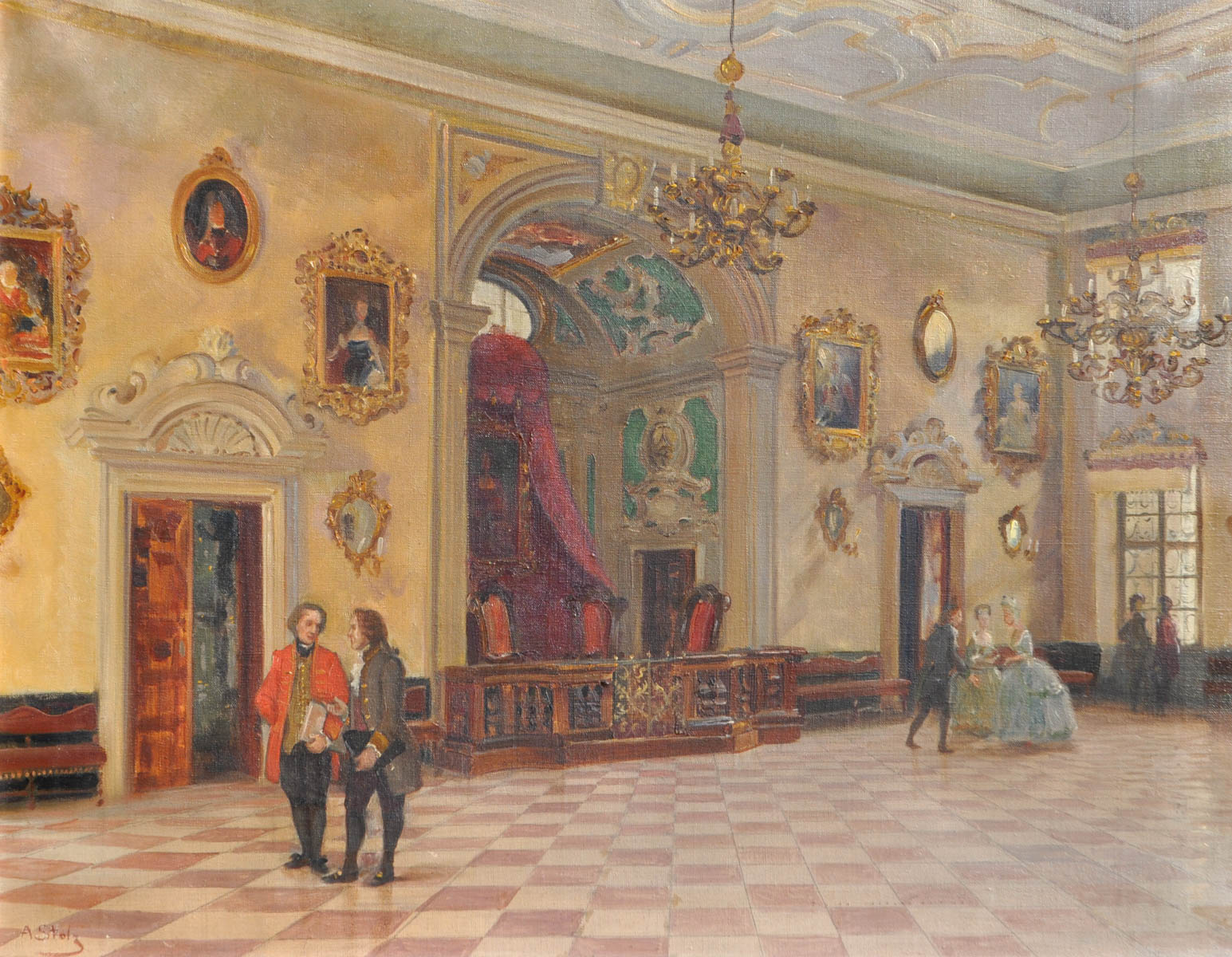 Albert Stolz (Bozen/Bolzano 1875-1947) Salone donore nel Palazzo Mercantile a Bolzano;Olio su tela, 52 x 66 cm, in cornice