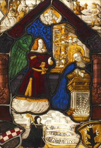 PICCOLA VETRATA FISSATA A PIOMBO, AREA GERMANICA, 1553, raffigurante l'Annunciazione e la visita dei Magi in policromia, il cartiglio in basso riporta la data 1553; due elementi crepati.