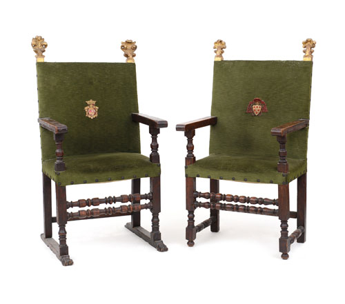 MOBILE DEL XVIII SECOLO DUE SEGGIOLONI IN NOCE CON FREGI DORATI, XVII SECOLO,...