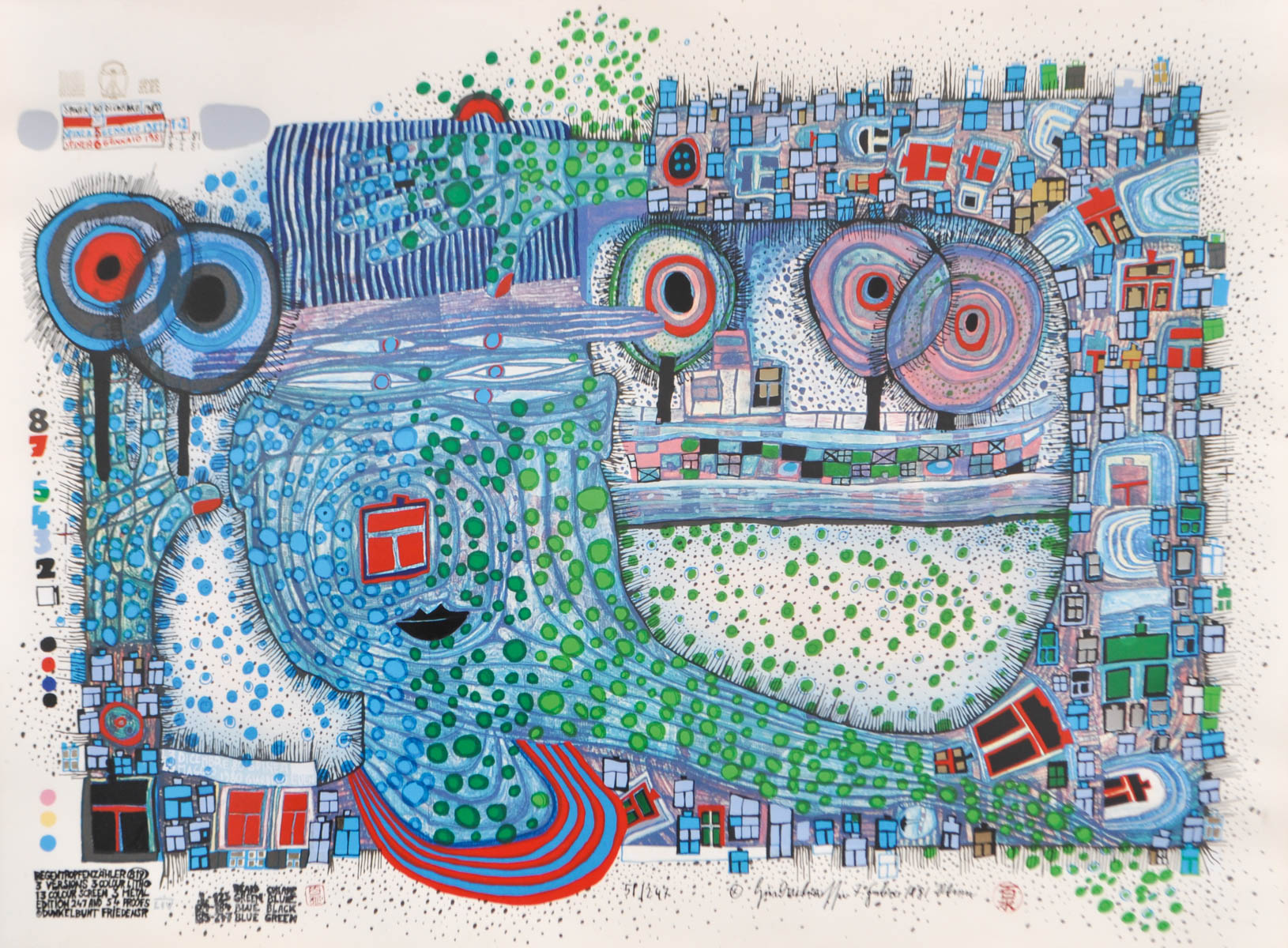 Friedensreich Hundertwasser (Wien1928 - Pazifischer Ozean/Pacifico 2000) Regentropfenzdhler (819), 1981;Litografia, 56 x 76 cm, in cornice