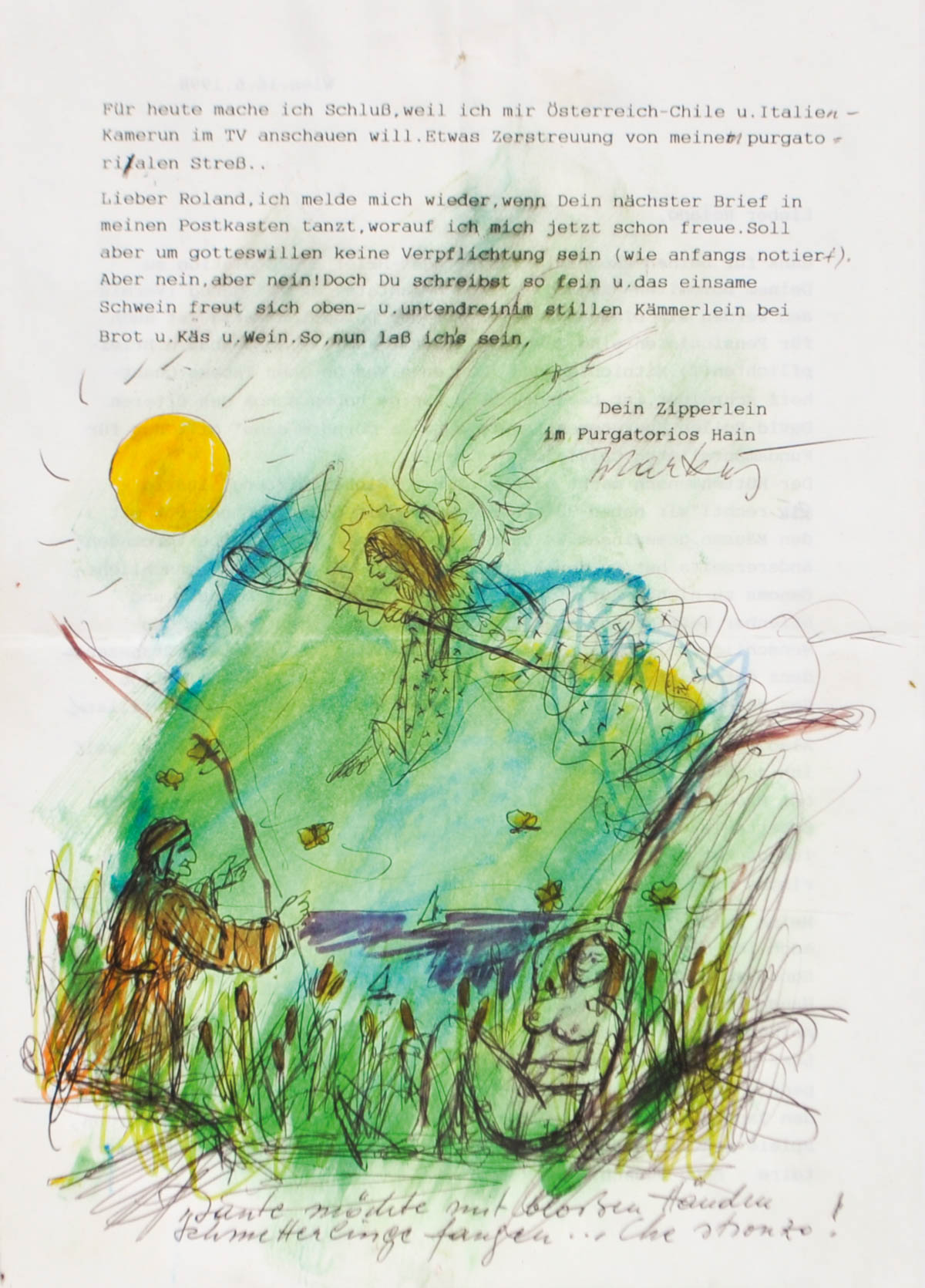 Markus Vallazza (St. Ulrich in Gröden/Ortisei 1936 - Bozen/Bolzano 2019) Dante va a caccia di farfalle a mani nude;Tecnica mista su carta, 22,5 x 20,2 cm, in cornice