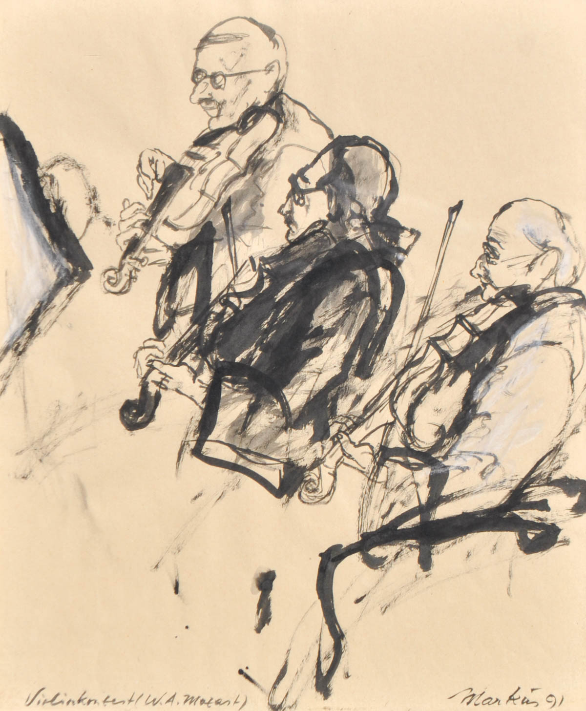 Markus Vallazza (St. Ulrich in Gröden/Ortisei 1936 - Bozen/Bolzano 2019) Concerto di violino W. A. Mozart, 1991;China e biacca, 40 x 33 cm, in cornice