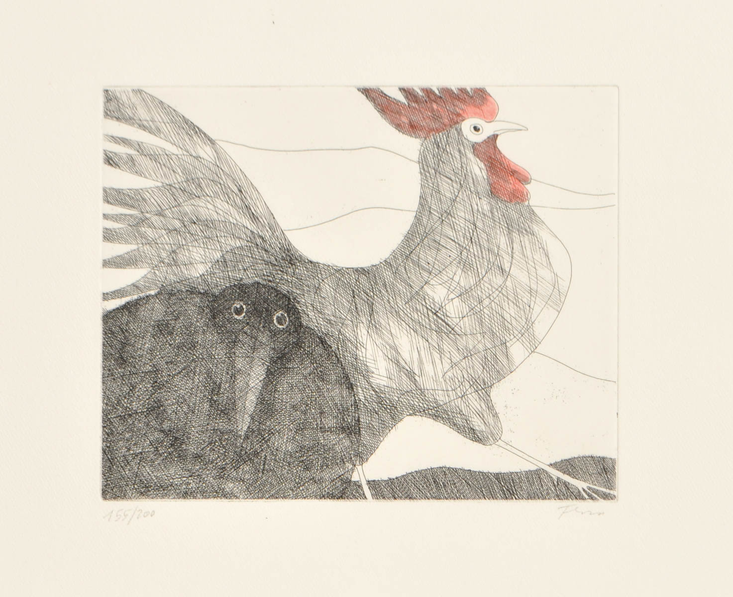 Paul Flora Corvo e gallo;Acquaforte colorata, 19,5 x 24,4 cm (lastra),