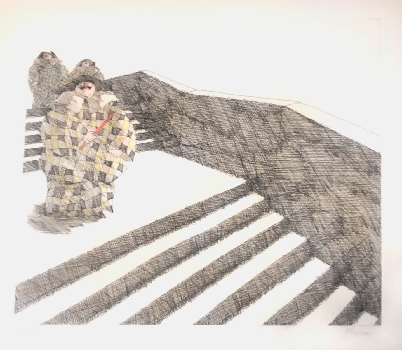 Paul Flora Pagliacci su scala;Acquaforte colorata, 21,5 x 24,5 cm (Lastra),