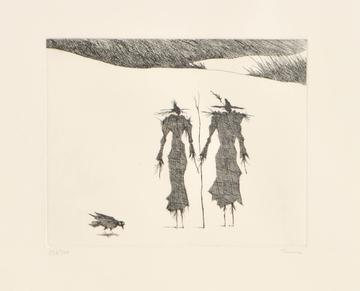 Paul Flora (Glurns/Glorenza 1922 - Innsbruck 2003) Corvo e due spaventapasseri;Acquaforte, 19,5 x 24,2 cm (lastra), in cornice