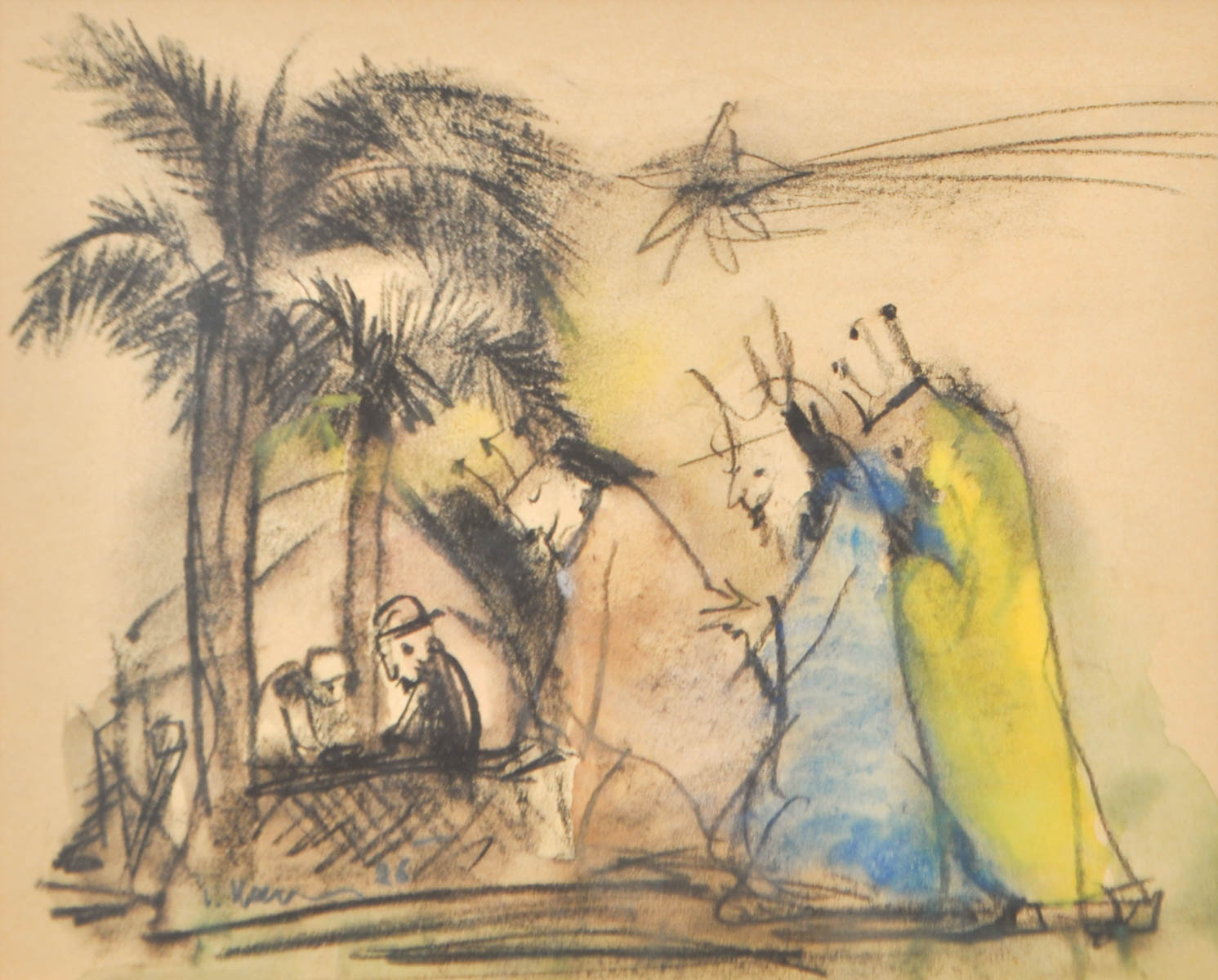 Vladislav Kavan (Baska, Tschechoslowakei / 1924 -Bozen 2003) Adorazione dei Magi, 1986;Tecnica mista su carta, 24,5 x 29 cm, in cornice