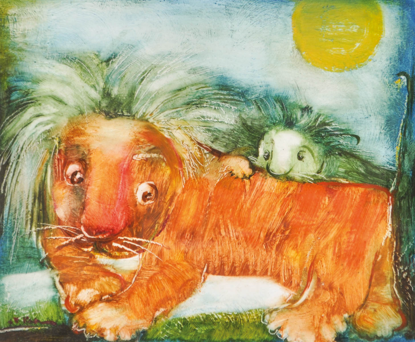 Vladislav Kavan (Baska, Tschechoslowakei / 1924 -Bozen 2003) Leone e leonessa;Olio su tavola, 27,5 x 31,8 cm, in cornice