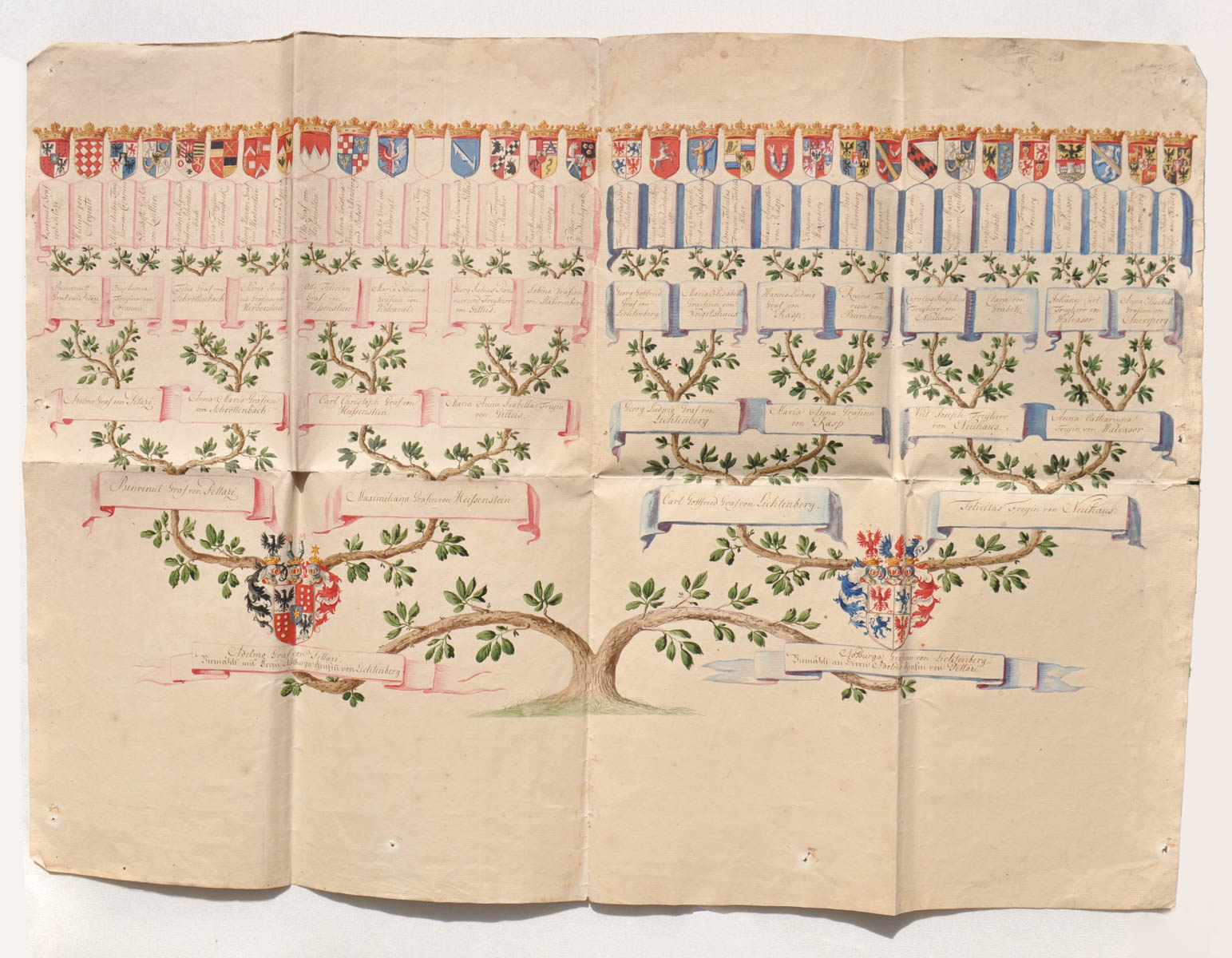 Anonym/Anonimo Documenti della famiglia dei conti Petazzi, Trieste/Gorizia, XVIII/XIX sec;4 alberi genealogici con sigilli, documento latino con 21