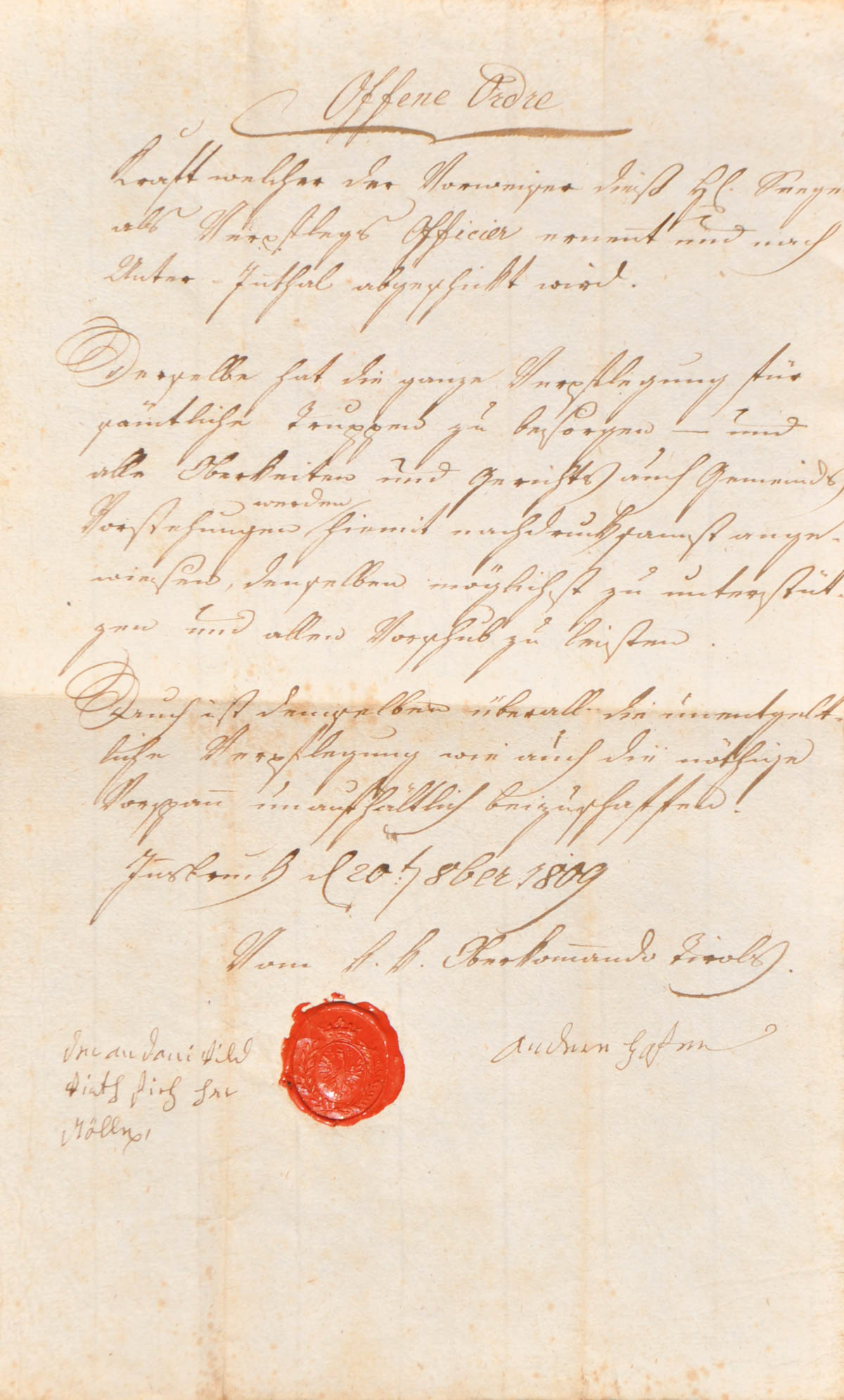 eigenhändige Passage Andreas Hofers, Amtssiegel, 36 x 22 cm