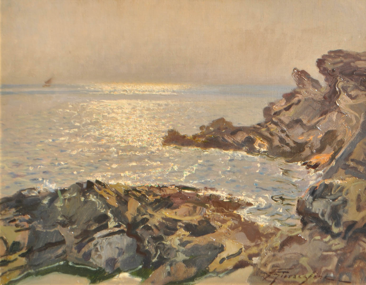 Ulderico Giovacchini (Florenz/Firenze 1890 - Bozen/Bolzano 1965) Paesaggio costiero in Italia;Olio su tela su cartone, 45 x 58 cm, in cornice