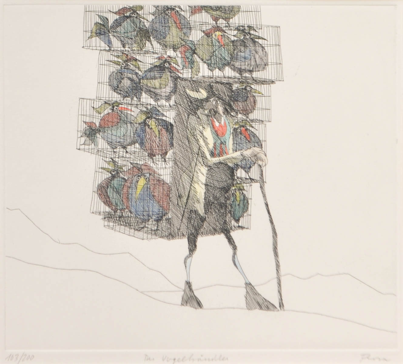 Paul Flora (Glurns/Glorenza 1922 - Innsbruck 2003) Lßuccellaio, 1988 ca.;Acquaforte colorata 21,7 x 24,5 cm, in cornice