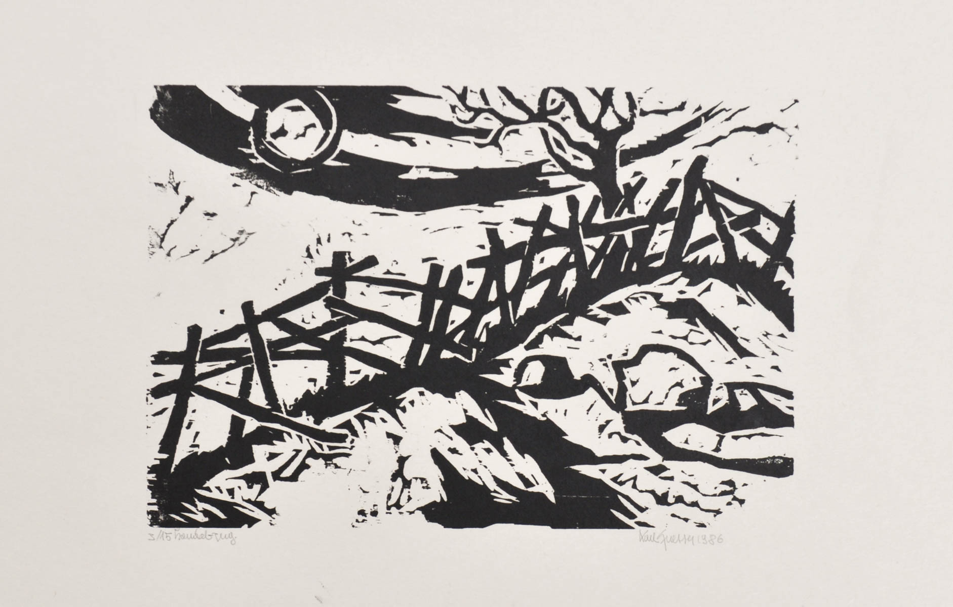 Karl Grasser Recinto al fianco di una montagna, 1986;Xilografia, 25 x 36,5 cm