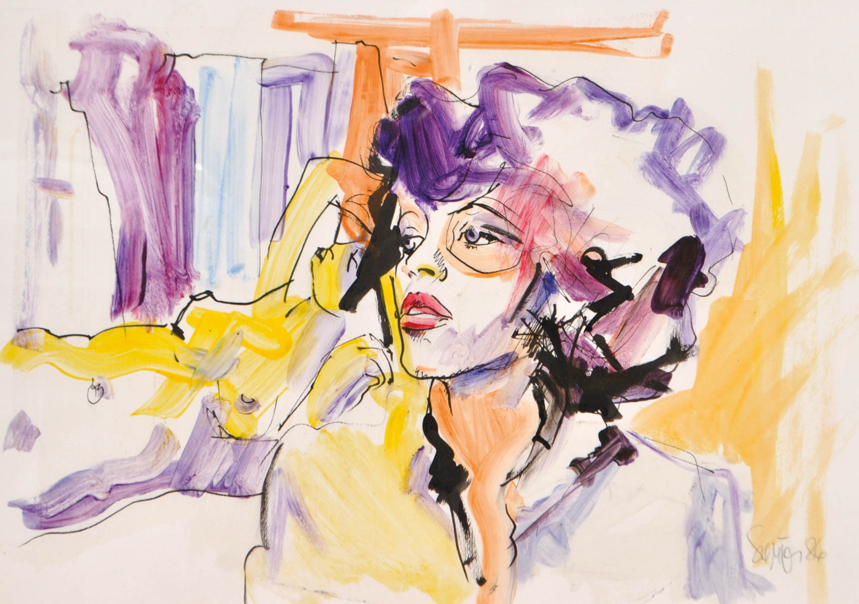 Sonya Hofer (Brixen/Bressanone 1948, lebt in Klausen/vive a Chiusa) Ritratto con nudo, 1986;China acquerellata, 47 x 66 cm, in cornice