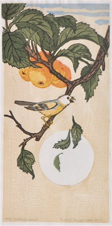 Rudolf Lanzinger (Brixen/Bressanone 1913 - Bruneck/ Brunico 1989) Uccellino su un ramo con mele,1975;Xilografia a colori, 30 x 14 cm,