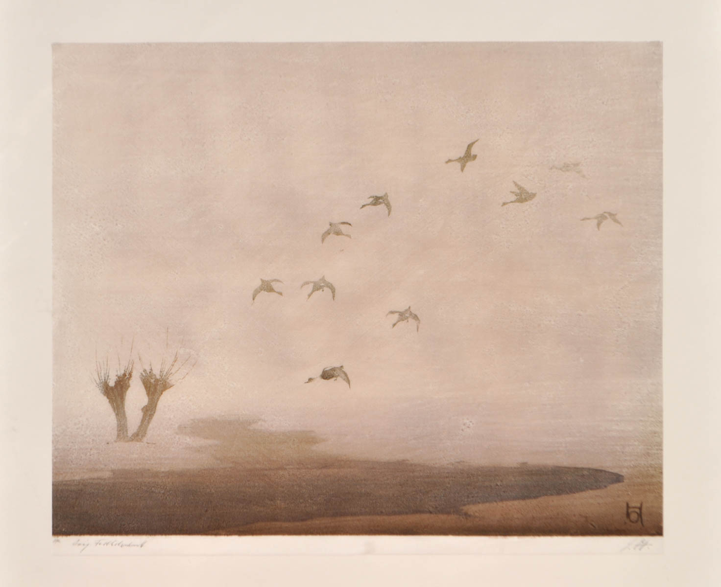 Lotto 706 | Hans Ott (Bad Berneck 1902 - Ebermannstadt 1982) Anatre in volo;Xilografia a...