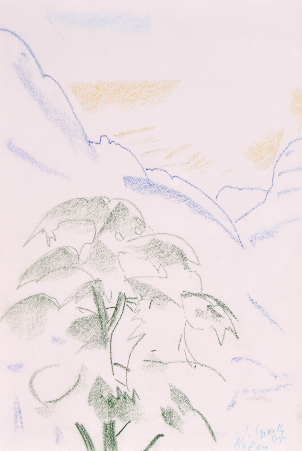 Siegward Sprotte (Potsdam 1913 - Kampen 2004) Bolzano, albero davanti a paesaggio alpino,1995;Gessetti colorati, 50 x 35 cm