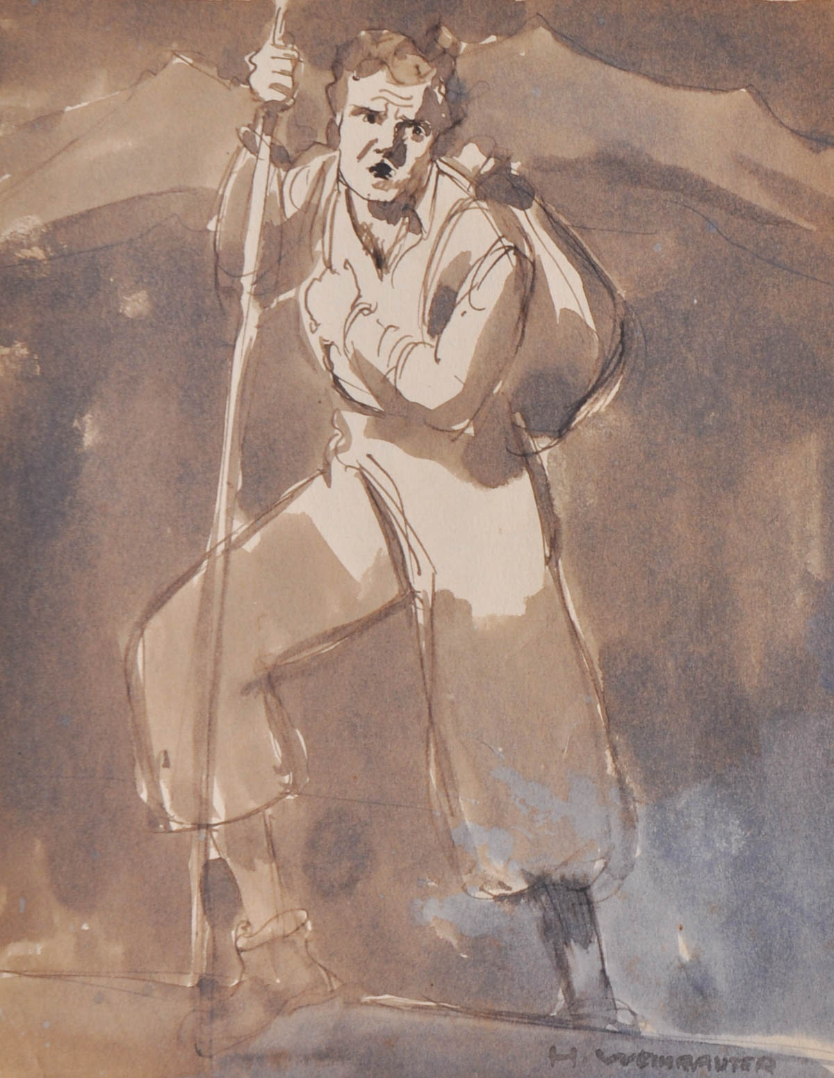 Herbert Weihrauter (München 1892 - Brixen/Bressanone 1977) Escursionista con zaino e bastone;China acquerellata, 19 x 15 cm