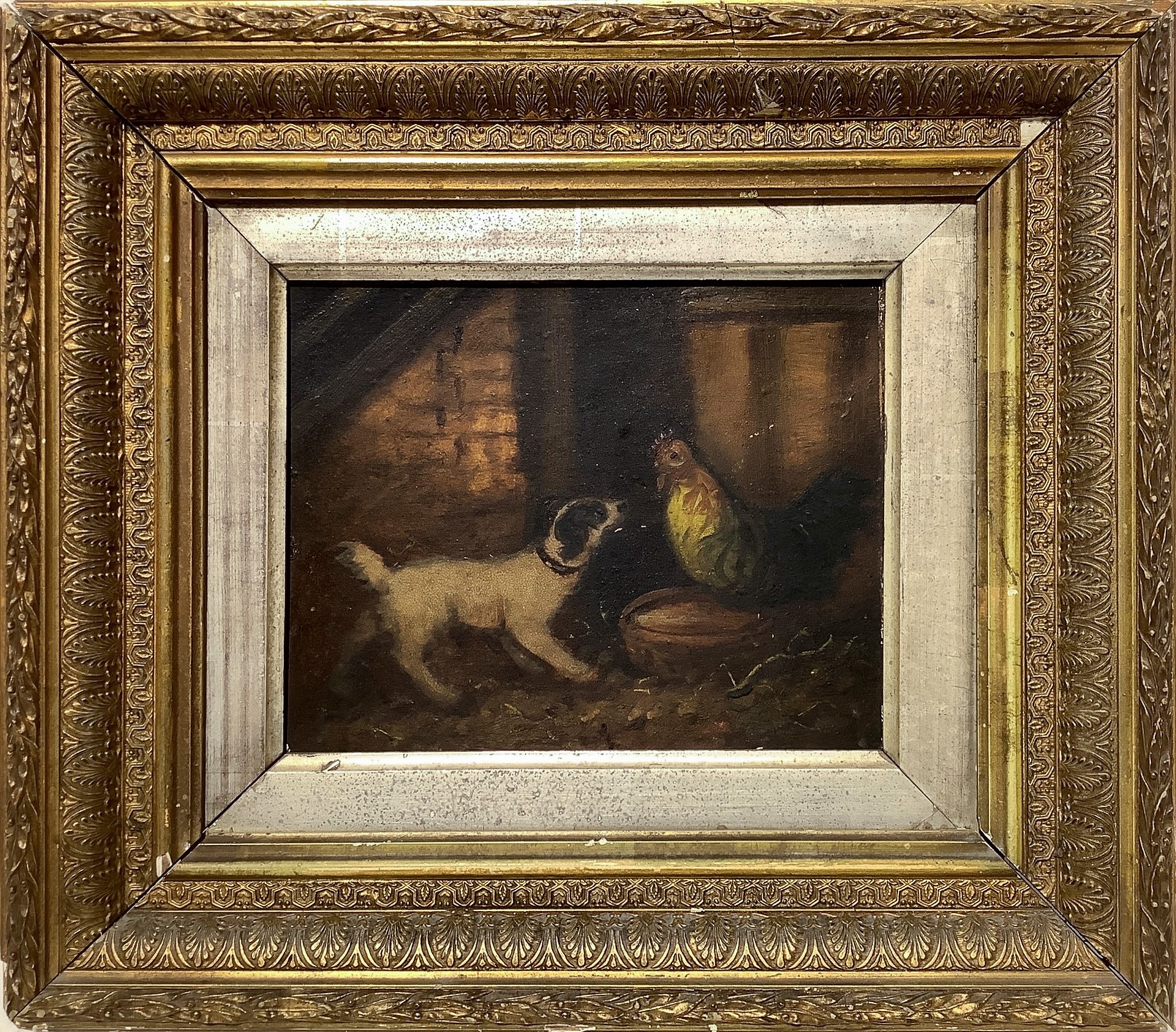 Cane e gallo 19x23 cm, in cornice 40x43 Olio su cartone pressato