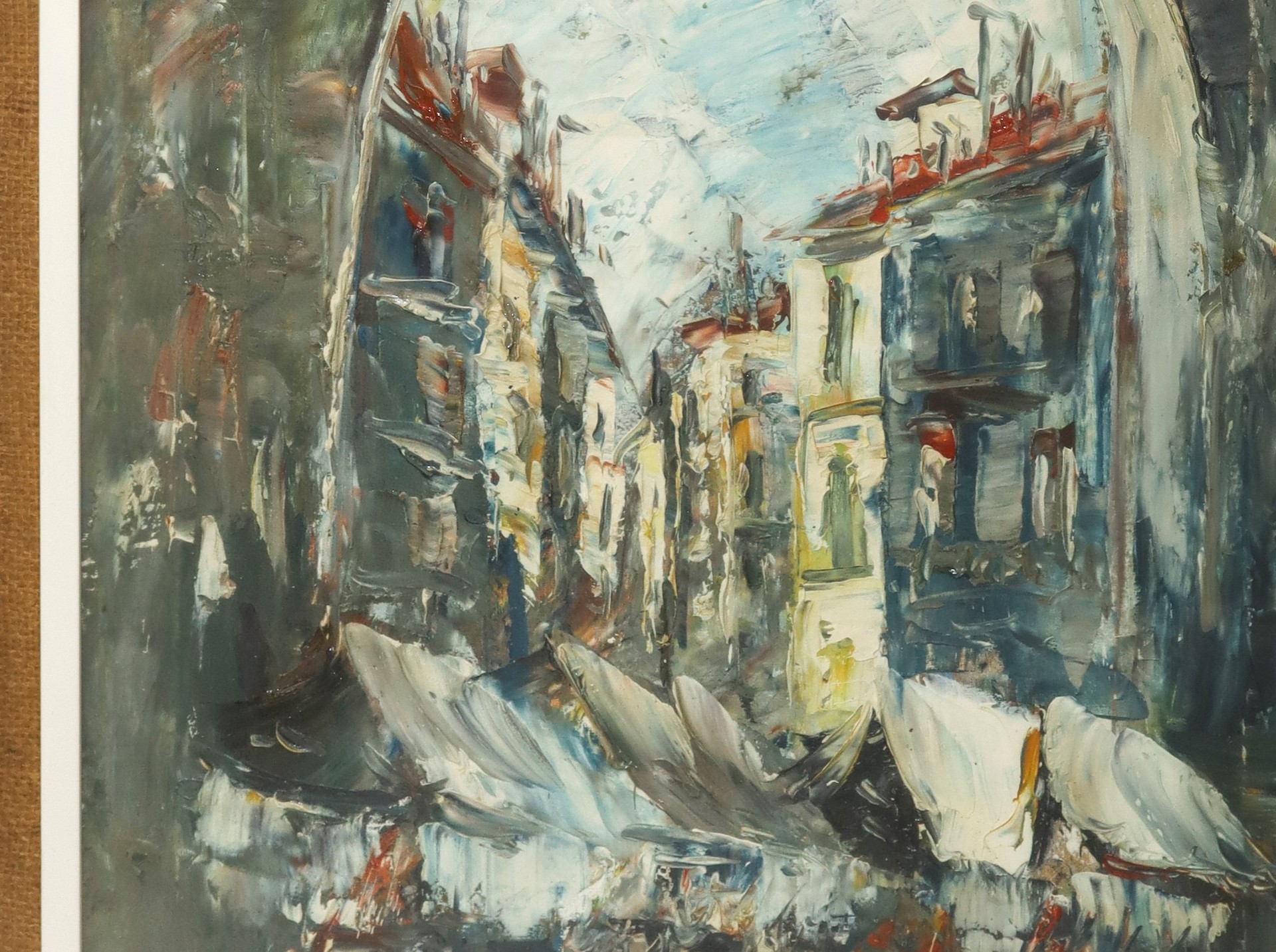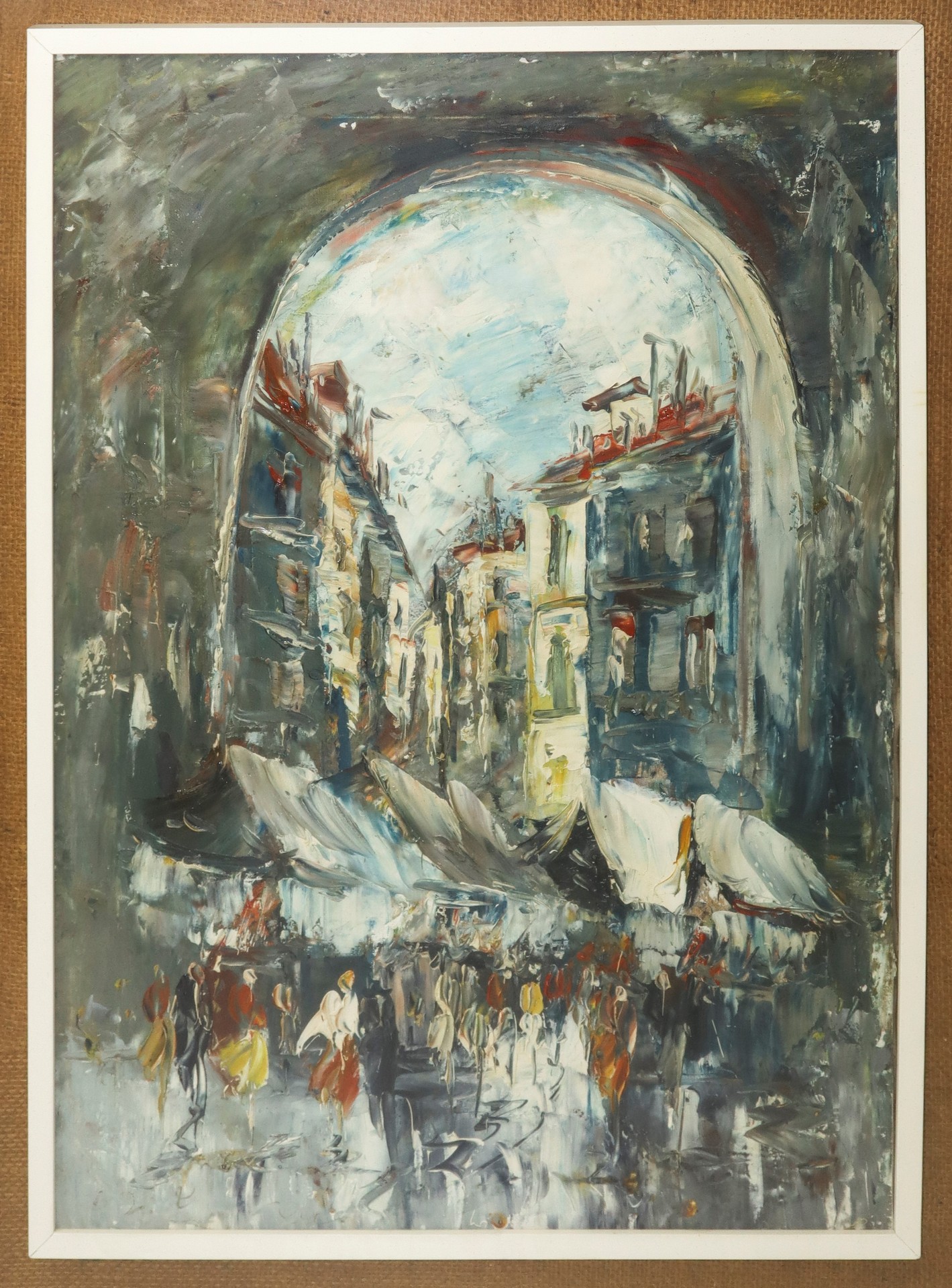 Scorcio di città con mercato sotto un arco, 20° secolo Cm 70x50, in cornice cm 88x78 Dipinto ad olio su tela