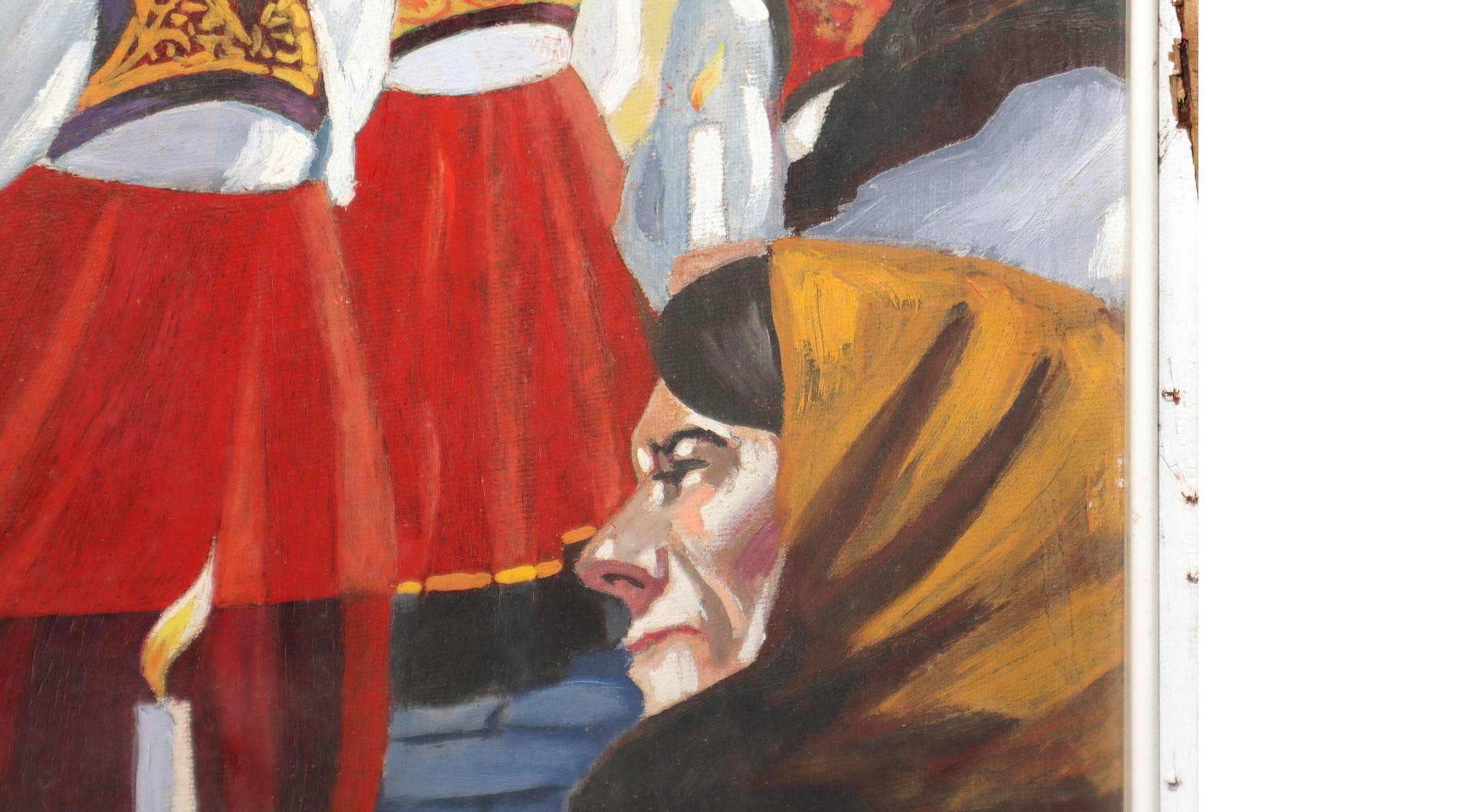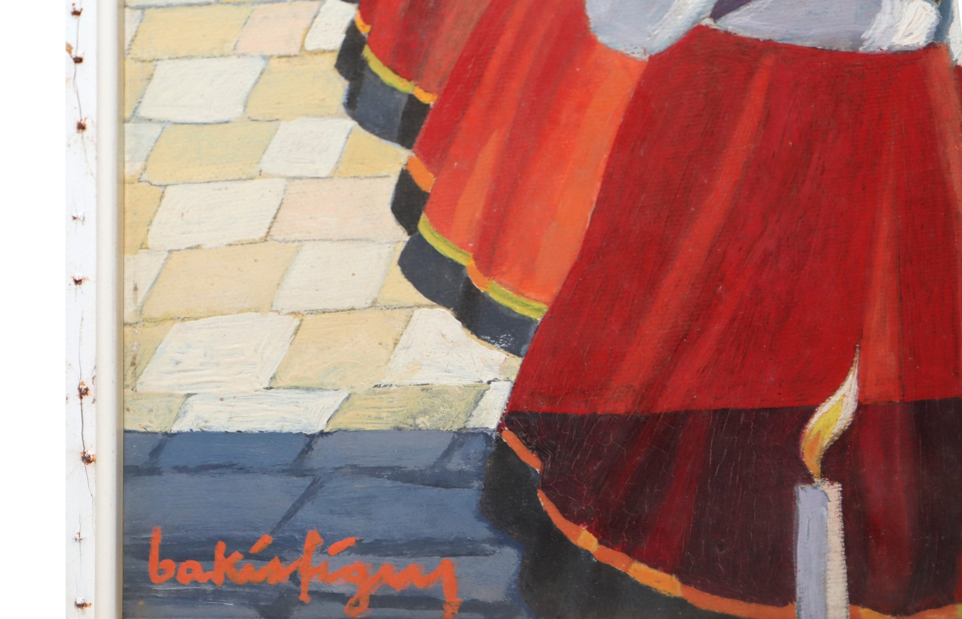 Bakisfigus (1905-1990) - Processione di donne h 40 x 25 , in cornice 63 x 47 Tempera su cartone telato Firmato in basso a sinistra.