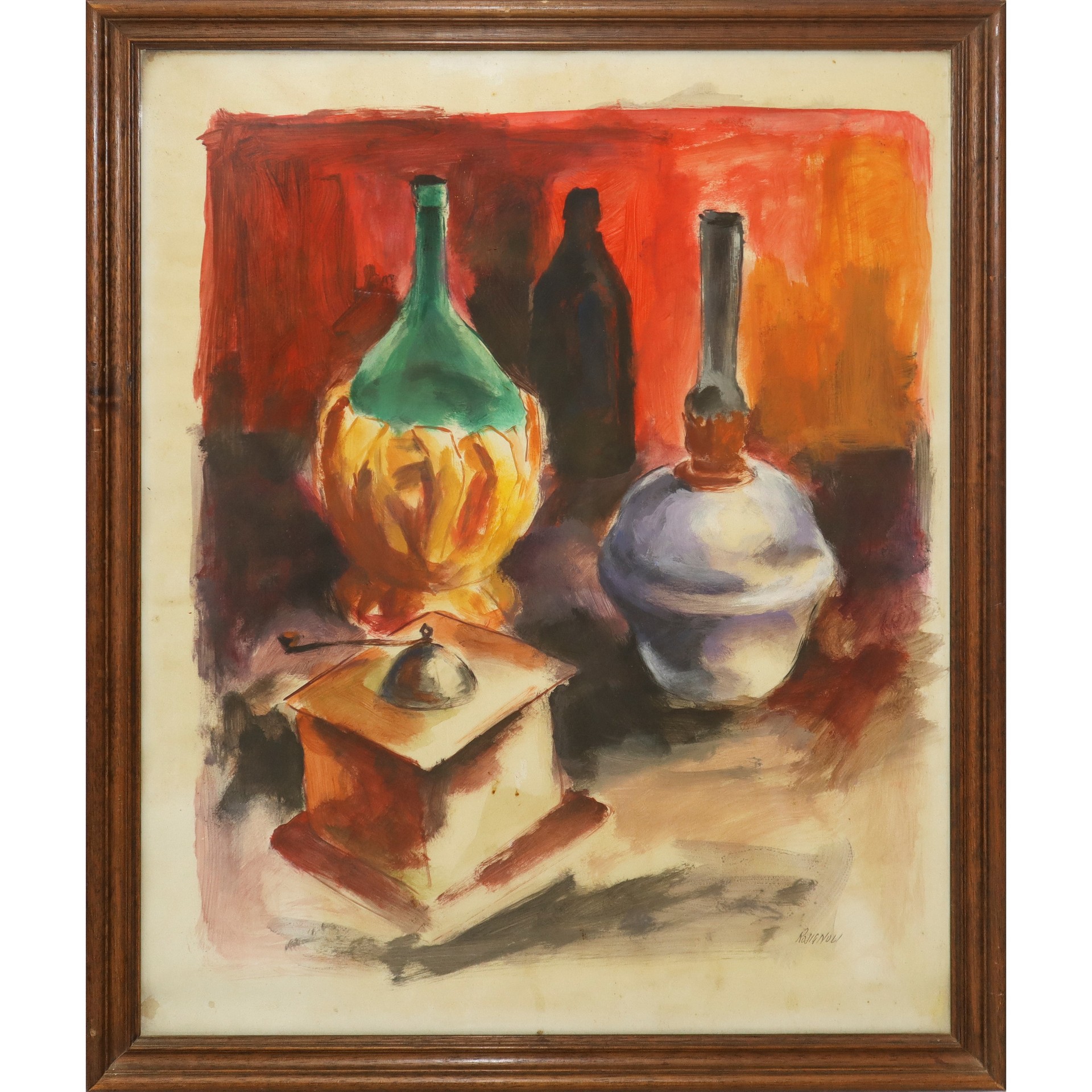Lotto 218 | Natura morta di bottiglie con lume e macinino