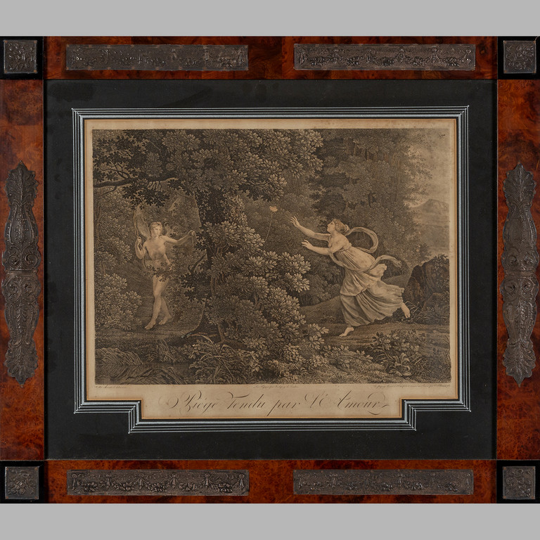 'Trappola d'amore' incisione Francia sec.XIX bella cornice in radica con inserti in argento
