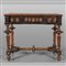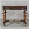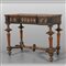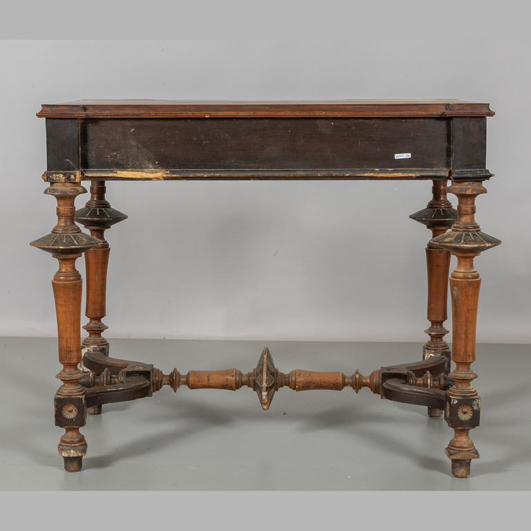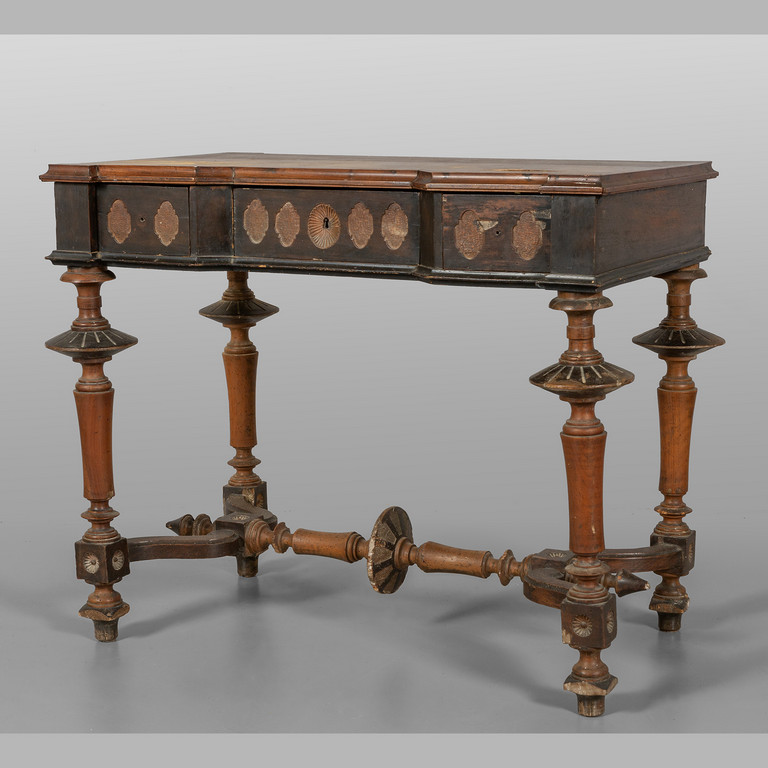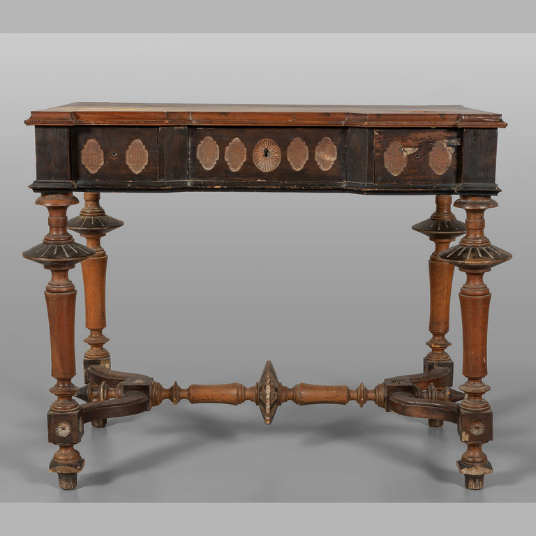 Tavolo eclettico con tre cassetti nella fascia e gambe raccordate da traversa