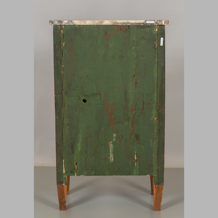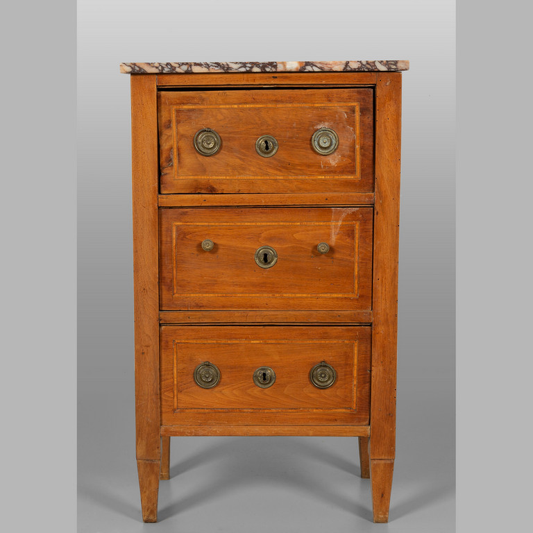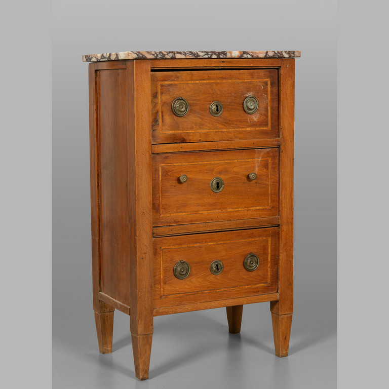 Mobiletto in stile Luigi XVI a due cassetti ed uno sportello intarsiato sul fronte in bois de rose piano in marmo