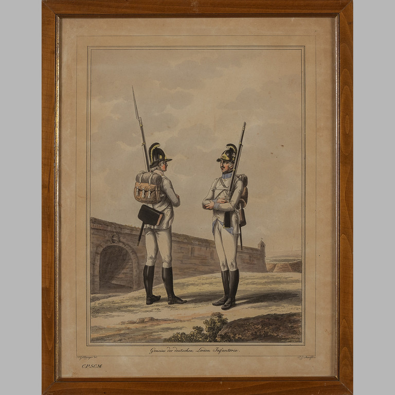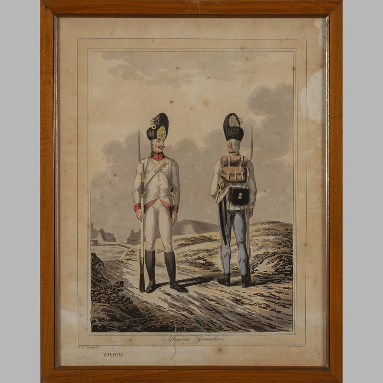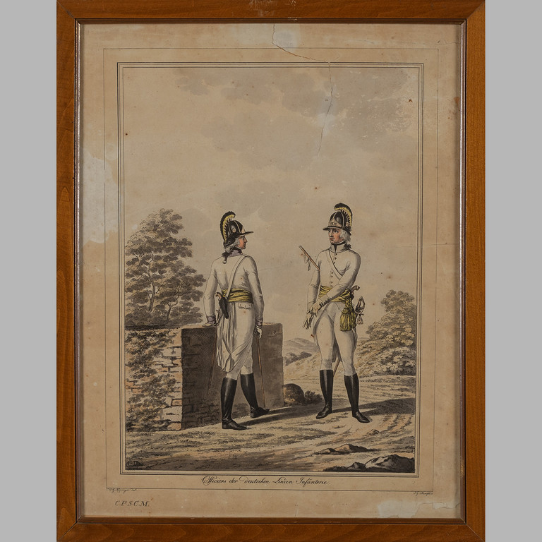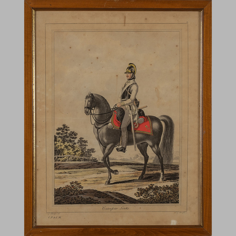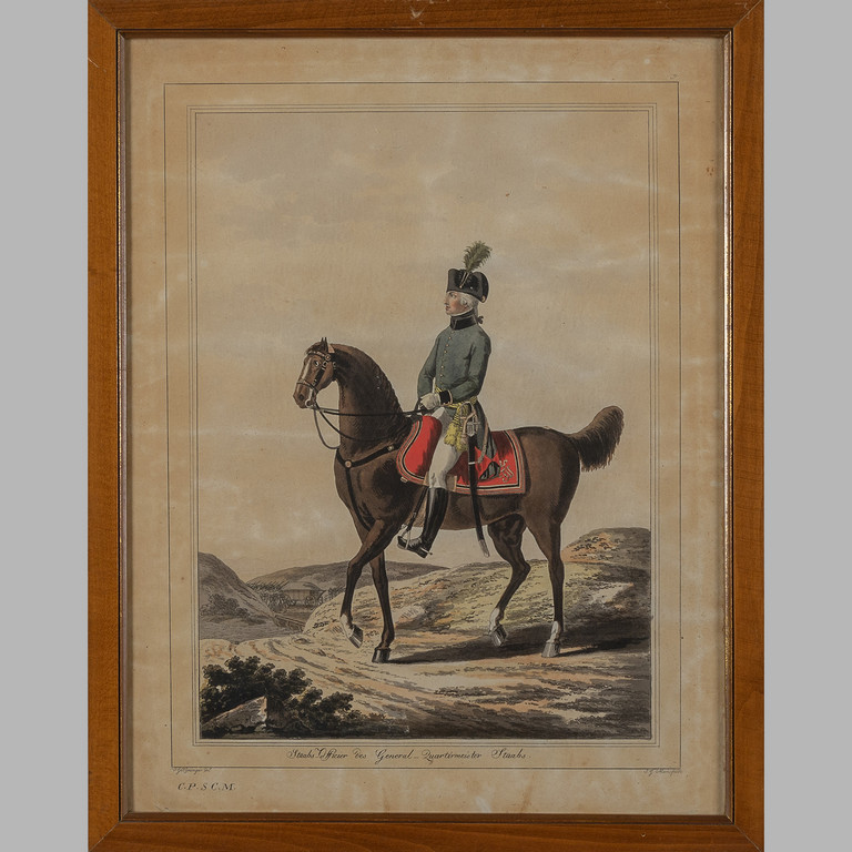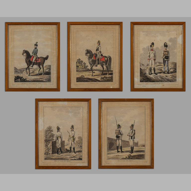 Soldati e generali a cavallo cinque incisioni colorate incisore Kininger