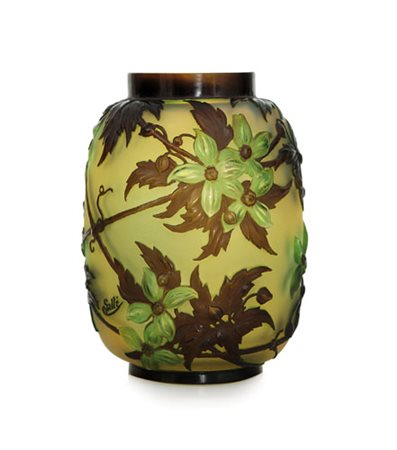 VASO SOUFFLE' IN VETRO DOPPIO, GALLE', 1920 CA., ovoidale con decoro a fiori di clematidi e foglie inciso ad acido nei toni del verde e bruno su fondo miele, firma in rilievo a cammeo "Gallé".