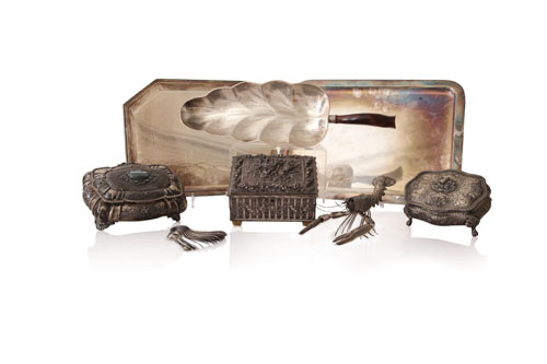 LOTTO DI DIVERSI OGGETTI IN ARGENTO, XX SECOLO, composto da tre scatole portagioie, due vassoi di cui uno in argento e uno in metallo Chistofle, un centrotavola a foglia, un modello di scampo e undici cucchiaini; usure.