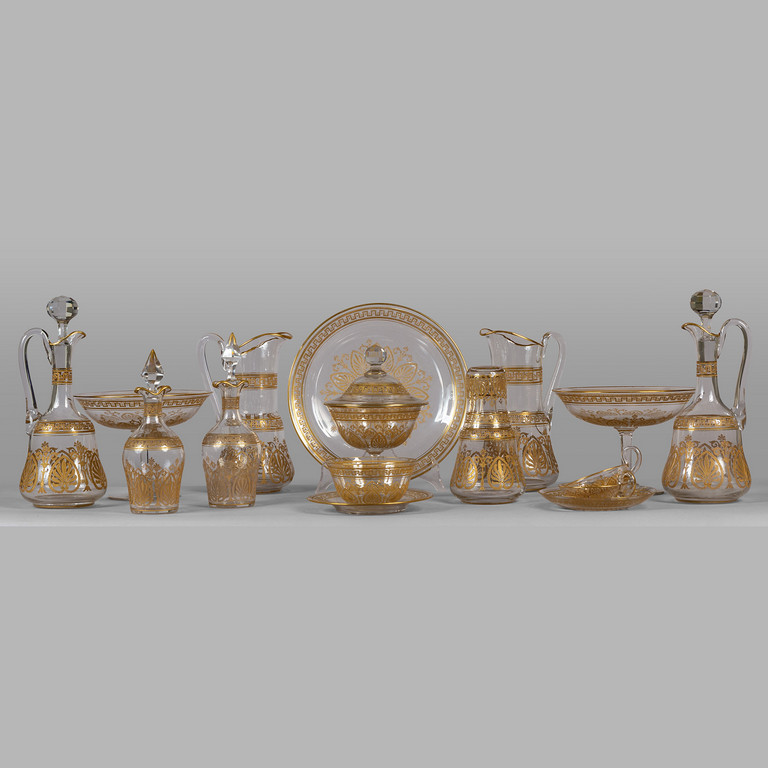 Insieme di oggetti da tavola in cristallo decorato in oro composto da: coppia di bottiglie coppia di caraffe coppia di ampolle coppia di alzate portabon-bon servizio da camera piatto due tazze piccola coppetta e due piattini