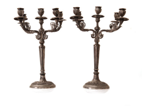 COPPIA DI CANDELABRI IN ARGENTO, XX SECOLO, in stile Impero, a cinque fiamme.