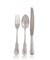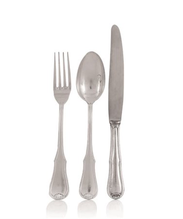 SERVIZIO DI POSATE IN ARGENTO, XX SECOLO, composto da dodici forchette, cucchiai e coltelli, dodici forchette e coltelli da frutta, dodici forchettine da dolce, dodici cucchiaini da caffè, sei posate da portata e un mestolo. (tot. pz. 91).