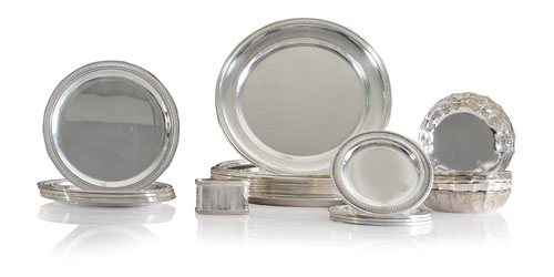 LOTTO DI DIVERSI OGGETTI IN ARGENTO, XX SECOLO, composto da dodici piattini, dodici sotto bicchieri, dieci piattini lisci, sei porta tovaglioli e sei ciotoline.
