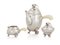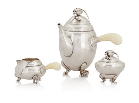 SERVIZIO DA TE' IN ARGENTO E AVORIO, GEORG JENSEN, 1905 CA., composto da teiera, lattiera e zuccheriera con coperchio, corpi ovoidali lisci su piedi a ricciolo, cimature a bocciolo, manici laterali in avorio; marchio "Denmark Sterling" e "Georg Jensen" entro ovale perlinato.