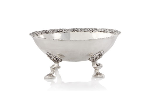 CENTROTAVOLA IN ARGENTO, TIFFANY & CO., INIZIO XX SECOLO, circolare su piedini, bordo a fiori e foglie a rilievo.