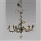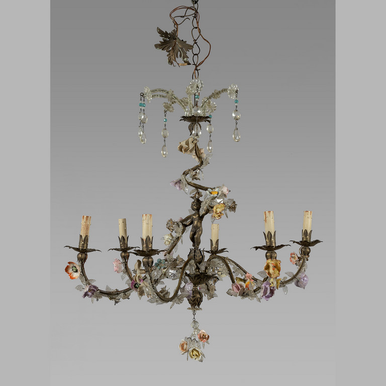 Lampadario a sei luci in lamierino con applicazione di cristalli e fiori in porcellana I metà sec.XX