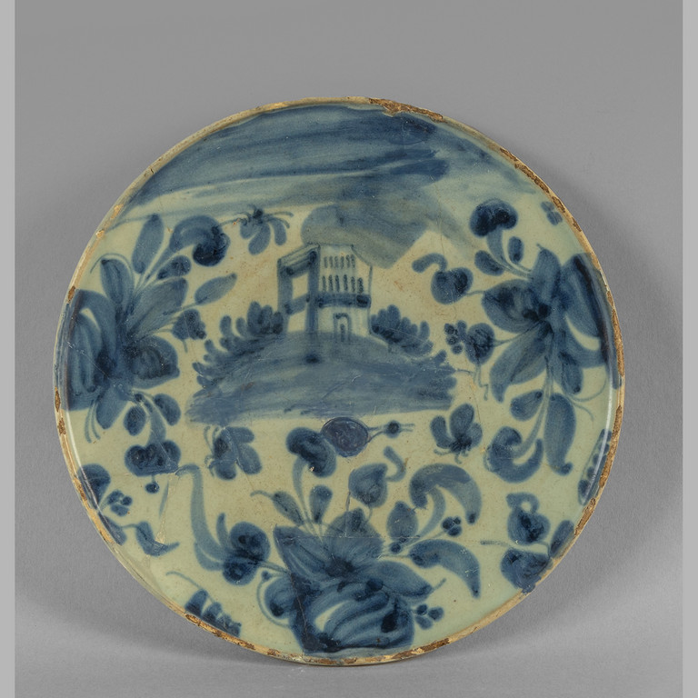 Alzatina in ceramica decorata bianco e blu con castello centrale Savona sec. XVIII
