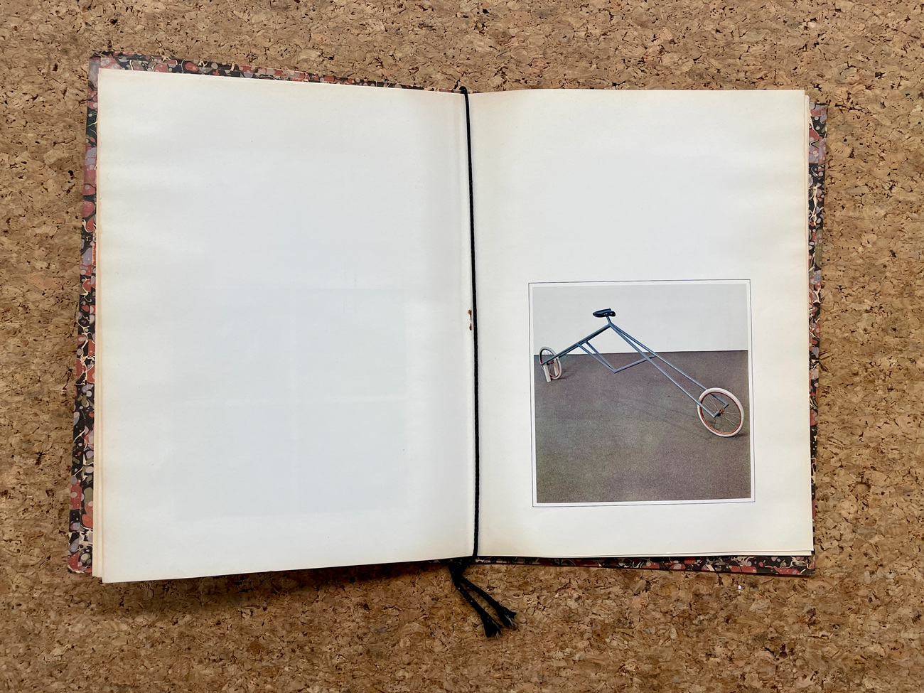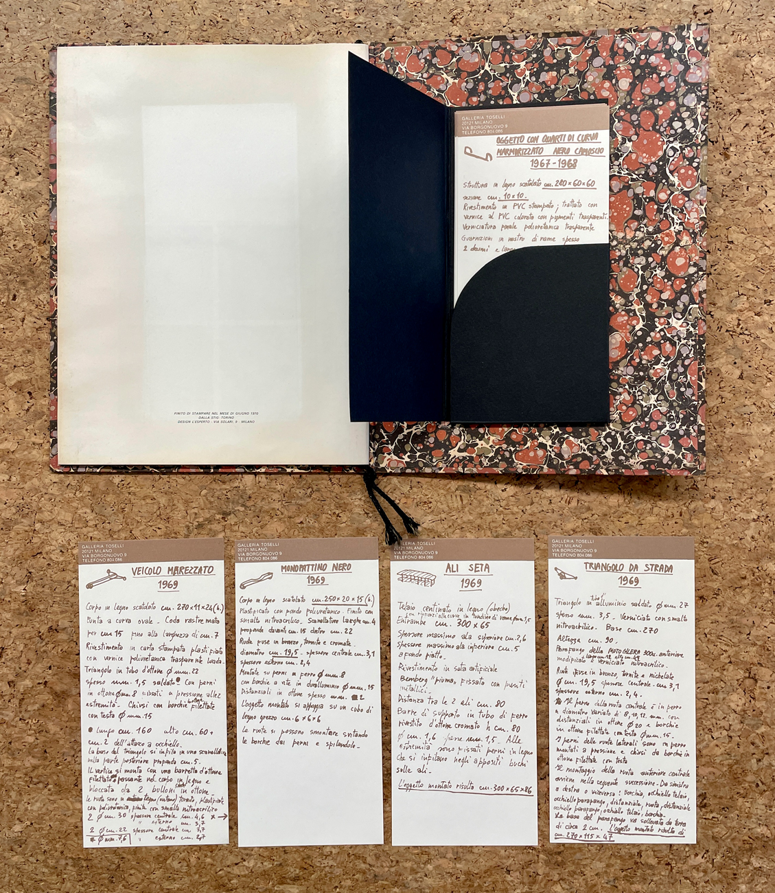 Sulla terza di copertina è applicata una busta nera contenente 12 schede con il progetto tecnico di altrettanti lavori dell’artista