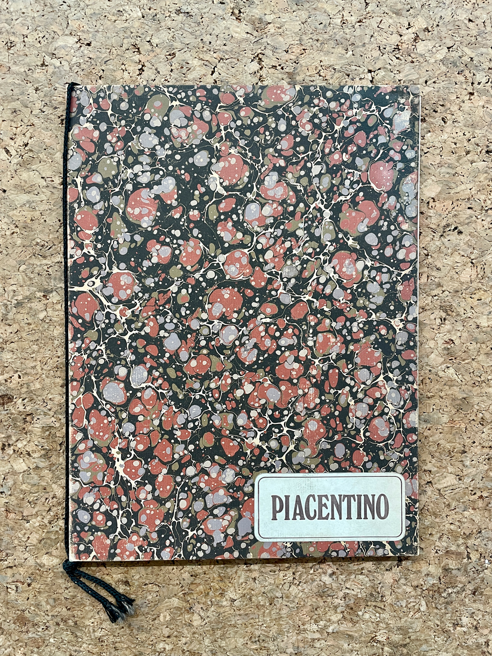Edizione d'arte recante fogli sciolti, ripiegati e legati con cordoncino e fiocchetto, contenuti entro cartellina rigida rivestita di carta marmorizzata