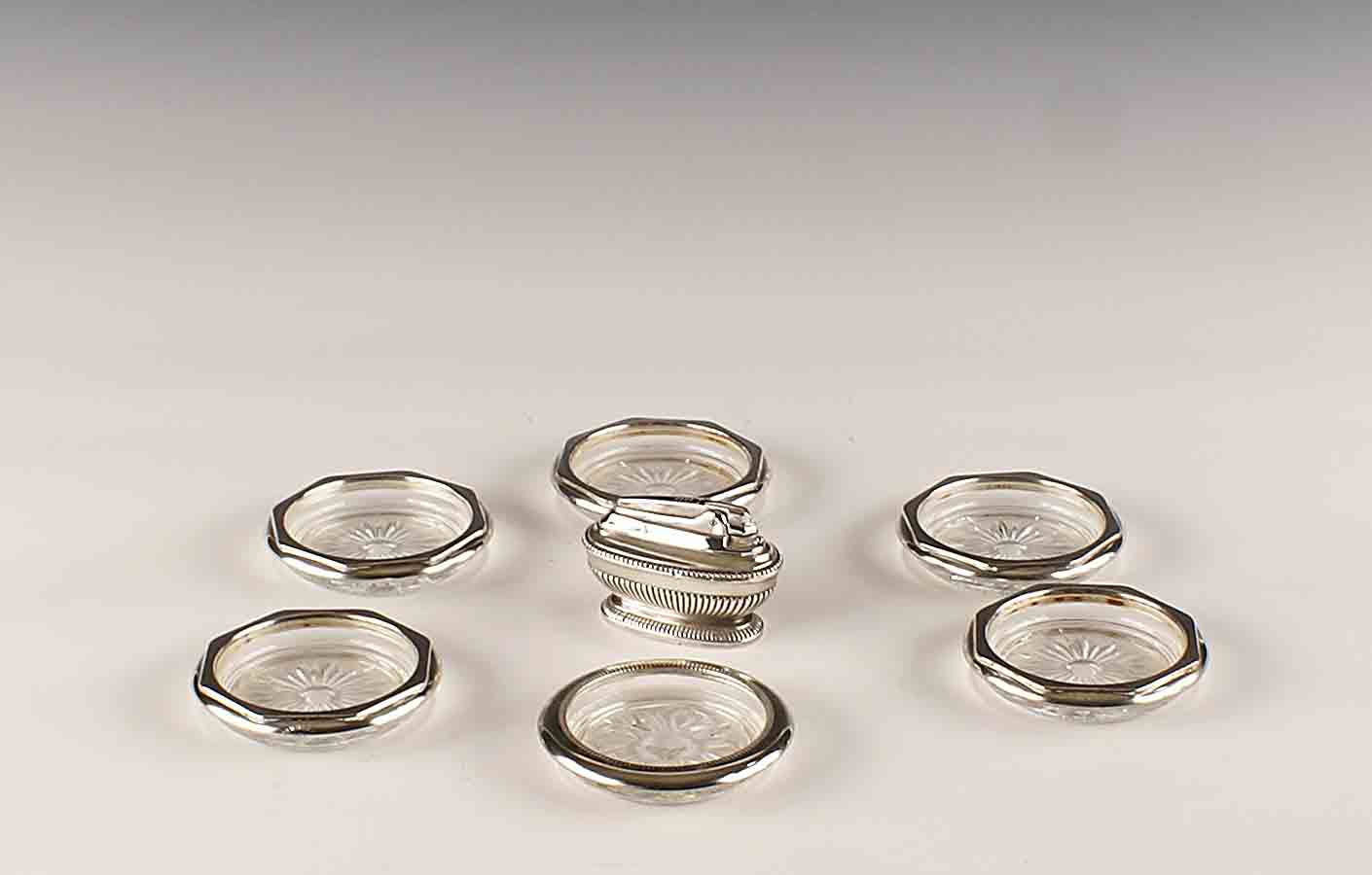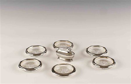 Lotto composto da un accendino Ronson e sei sottobicchieri in silverplate e vetro, uno di foggia diversa.