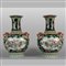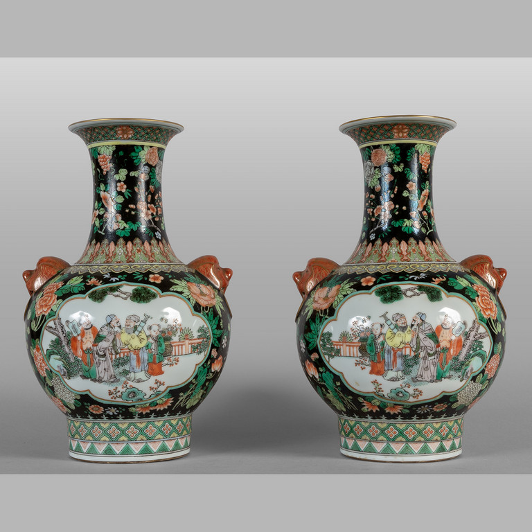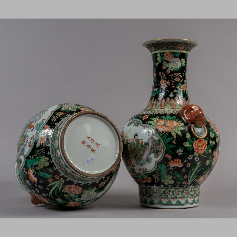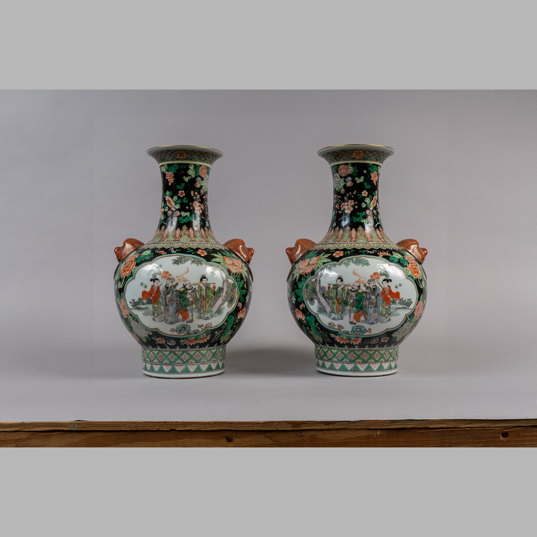 Coppia di vasi in porcellana decorati in policromia con personaggi su fondo nero Cina sec.XX