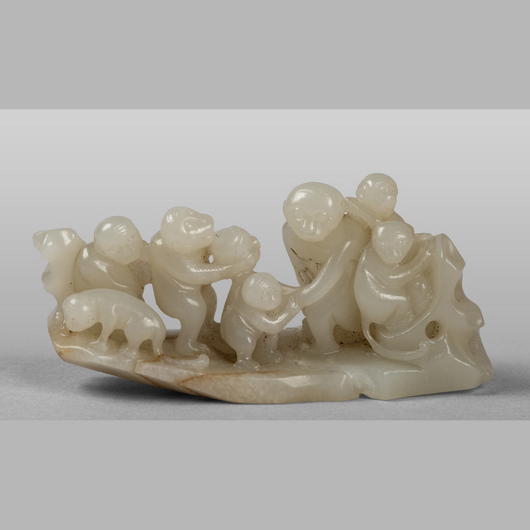 Giada bianca intagliata a motivo di famiglia di scimmie Cina