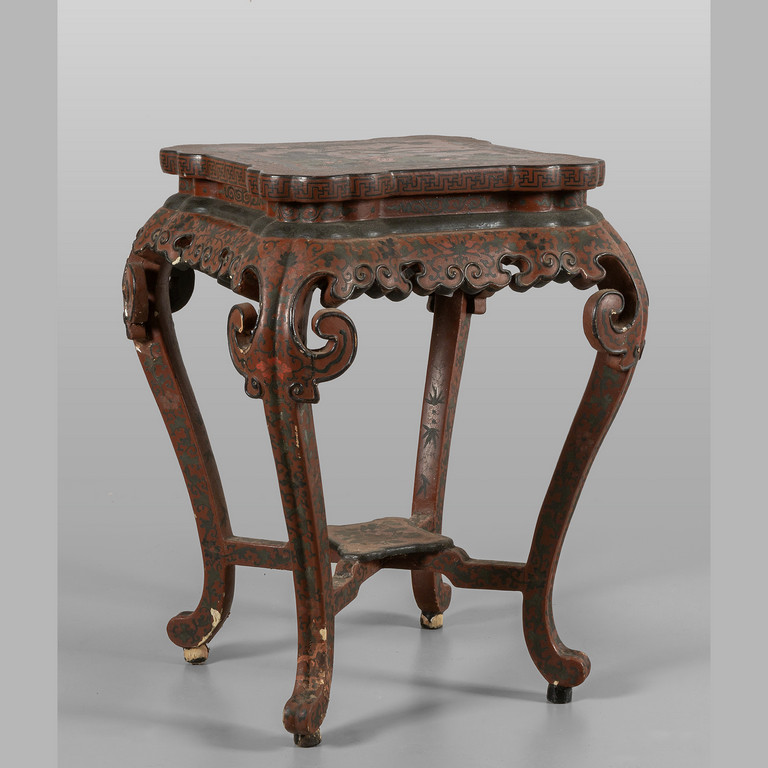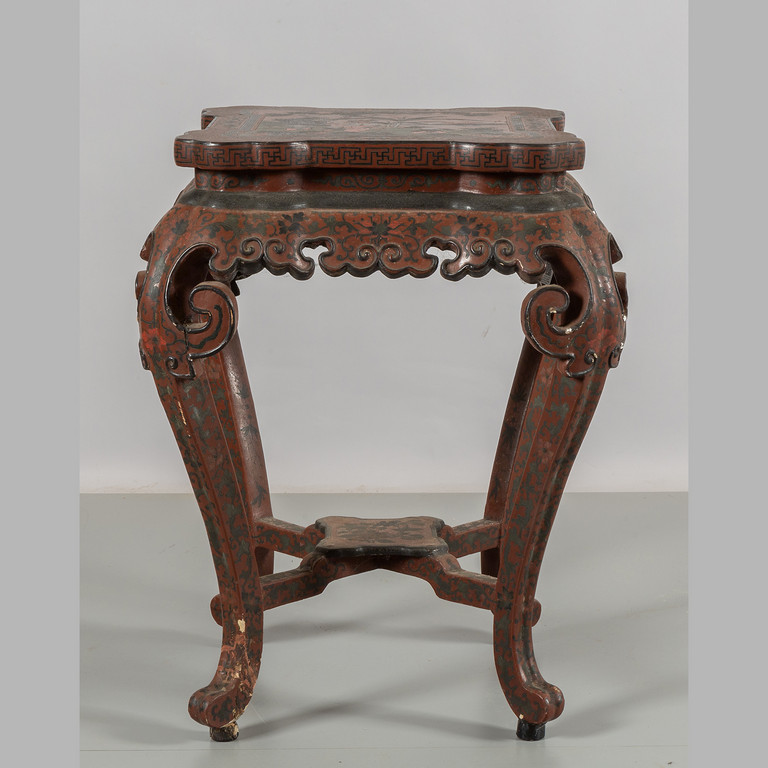 Tavolo da centro in lacca a fondo rosso gambe riunite da traversa Cina sec.XX