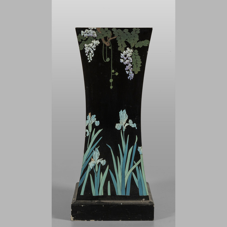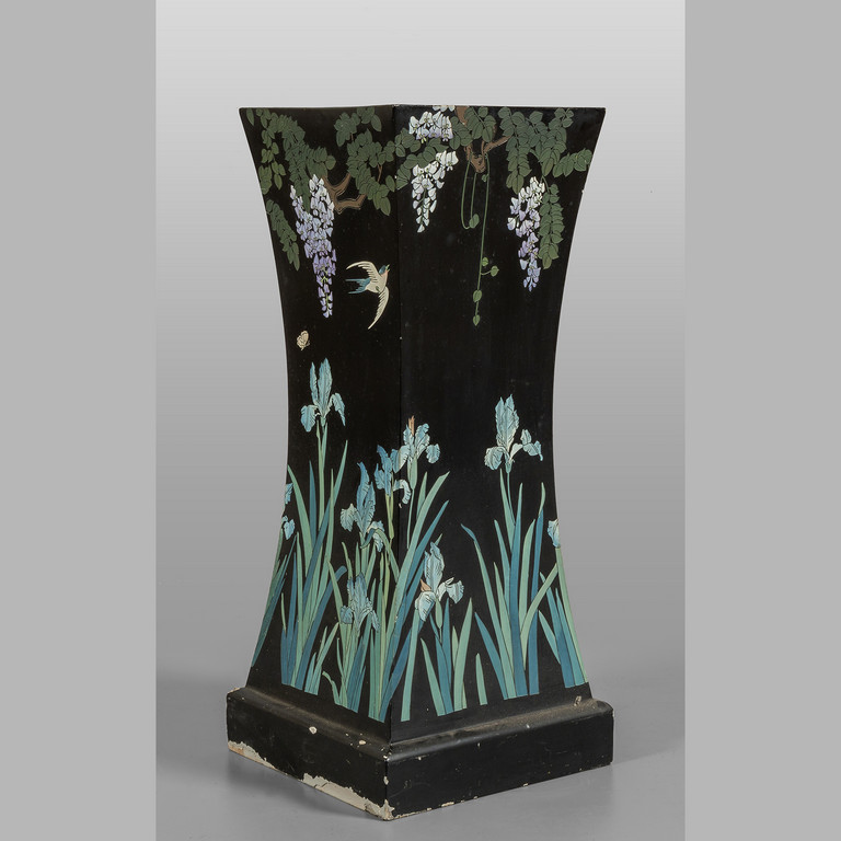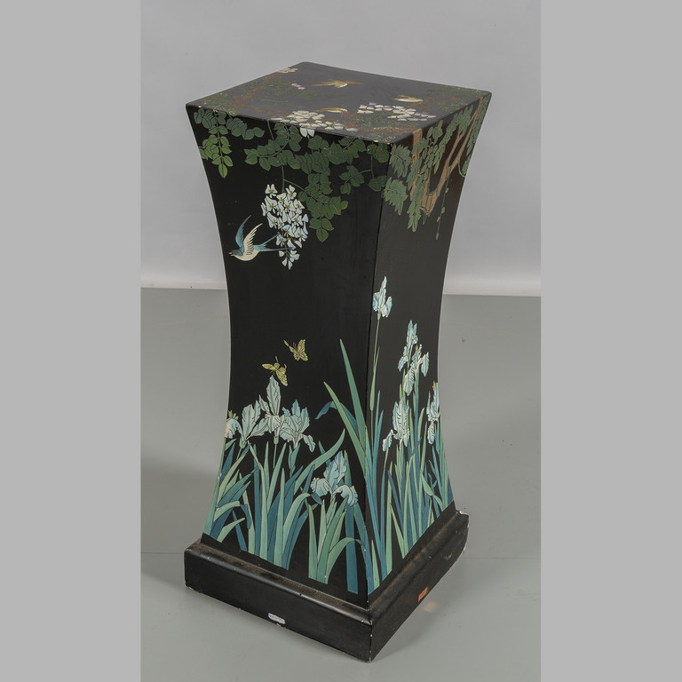 Colonna in legno laccato a fondo nero decorata in policromia con glicine gladioli e rondini sec.XX