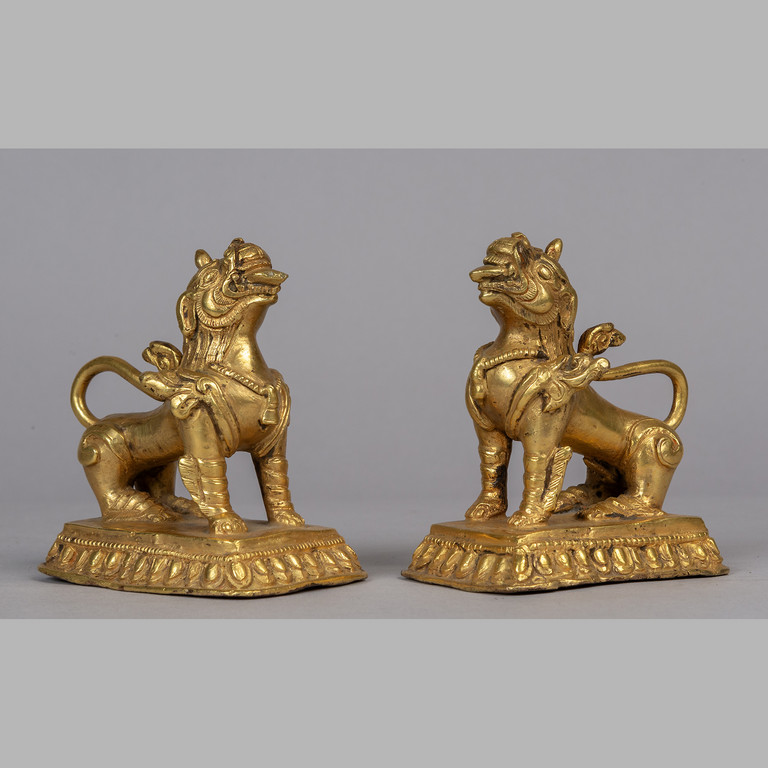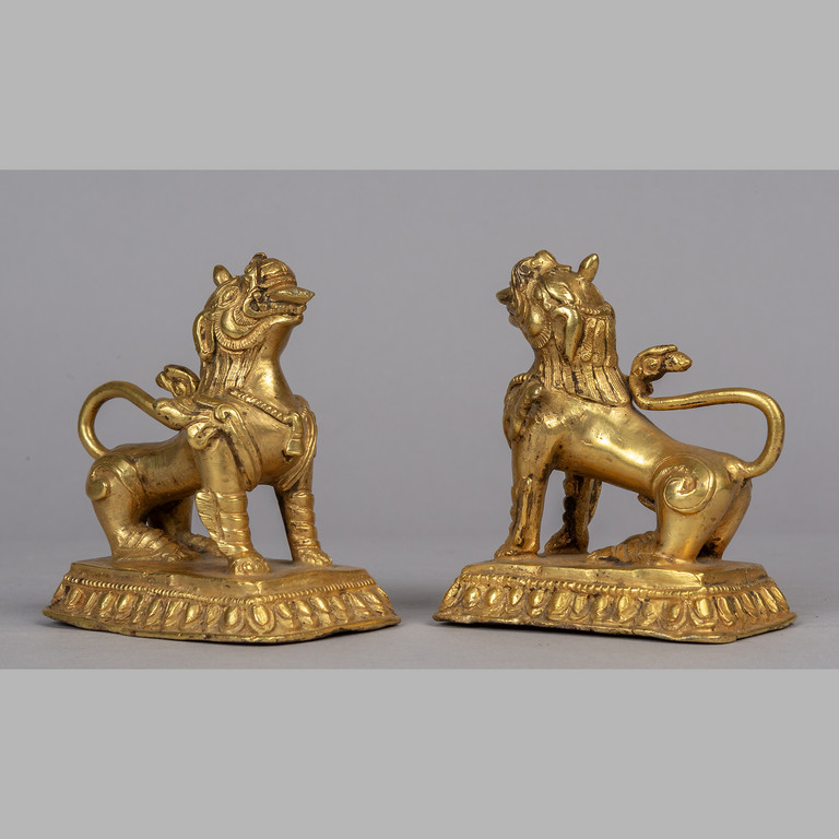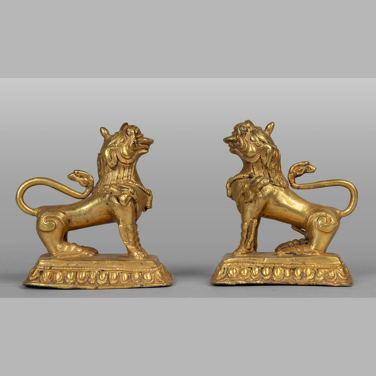 Leoni alati coppia di sculture in bronzo dorato Tibet sec.XIX