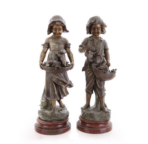 Coppia di sculture in metallo patinato, alt. cm 61.