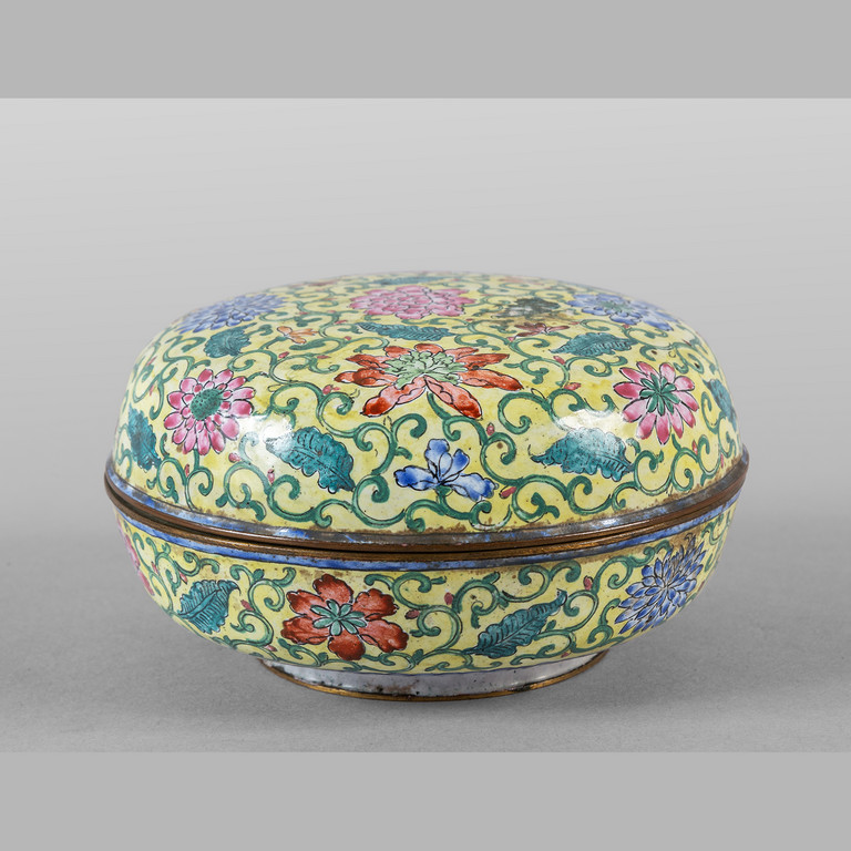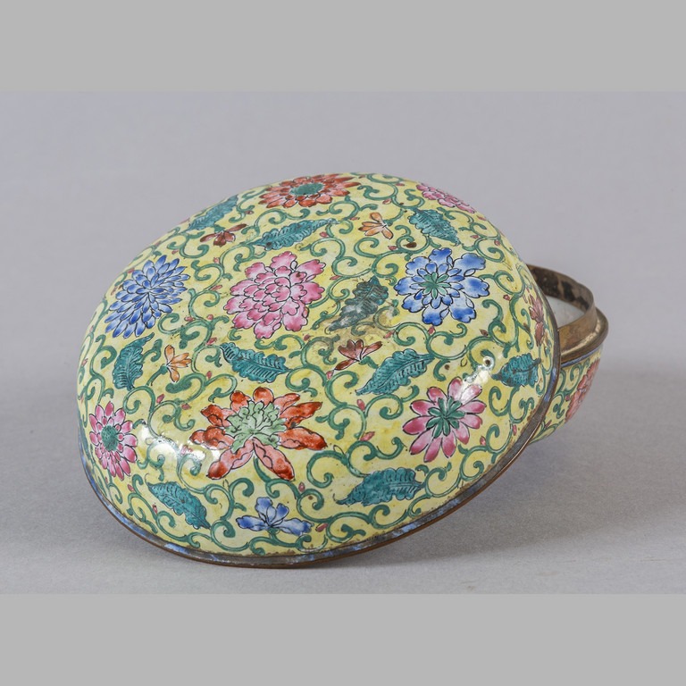 Scatolina in smalto decorata a fiori su fondo giallo Cina fine sec.XIX