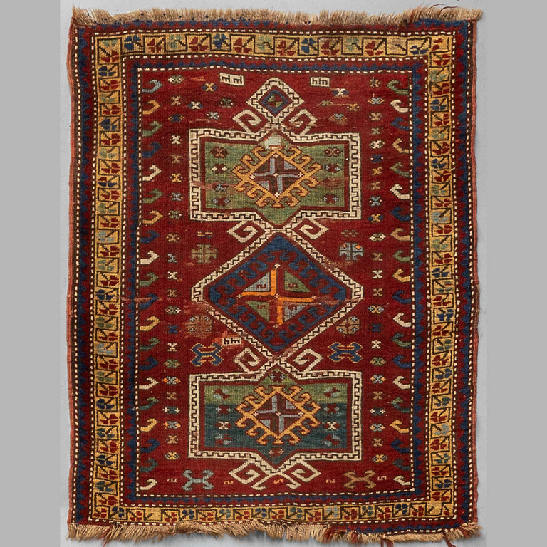 Tappeto Kazak a tre rombi con bordo azzurro Caucaso inizi sec.XX
